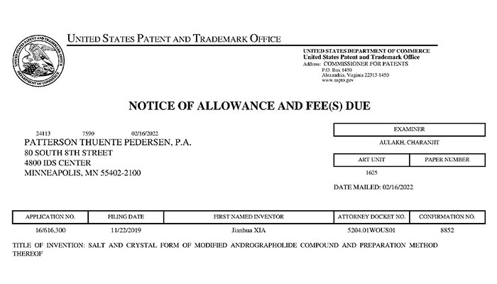 双色球预测 获得穿心莲内酯改构化合物美国专利授权通知书