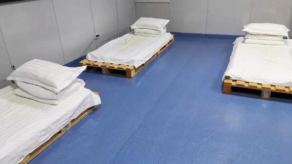 由于新冠病毒传染性强、潜伏期长等特性,配送人员多次往返医院等高危场所,接触人员复杂,极易暴露,为节约时间,同时消除疫情扩散的潜在隐患,值班人员把公司培训室改成临时卧室,两张木质托盘一拼就成了他们的床,当我们还沉睡在被窝里时,他们已经在送货的路上。